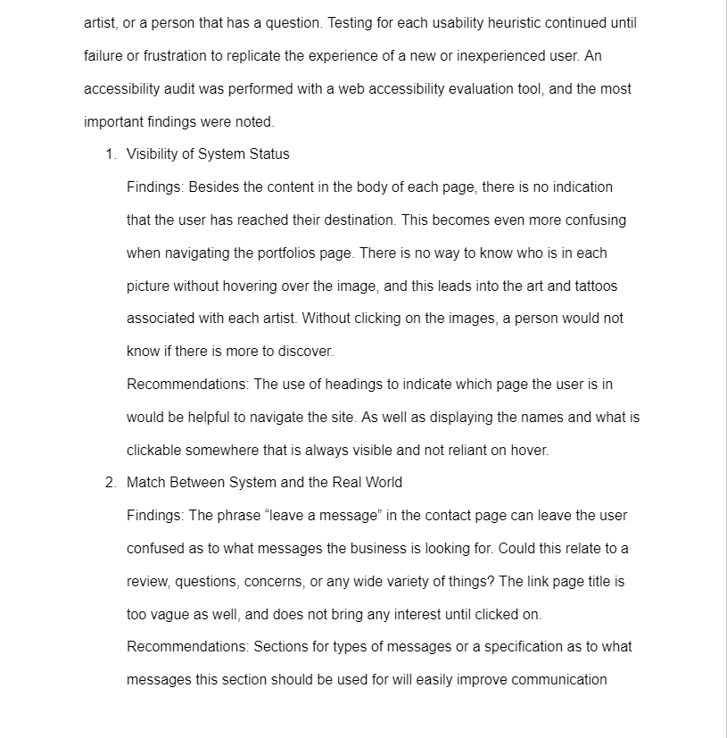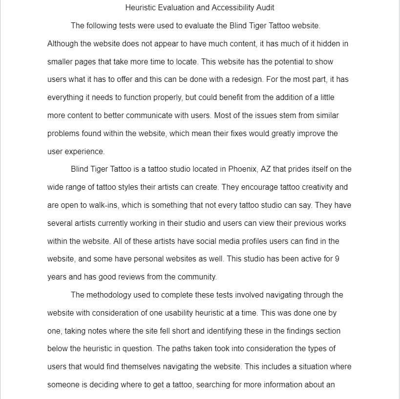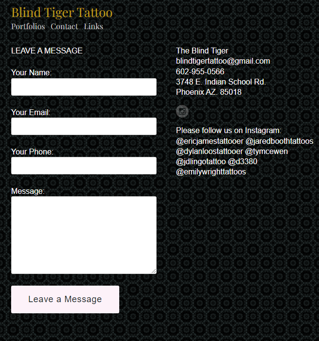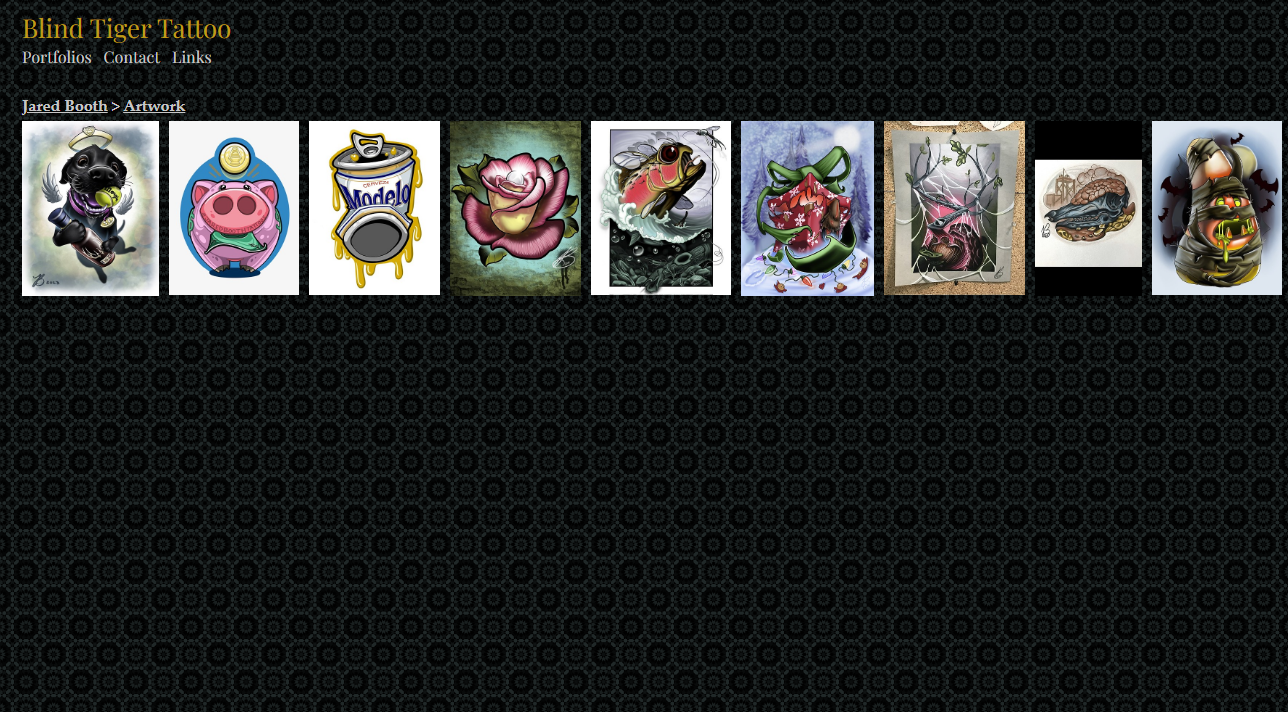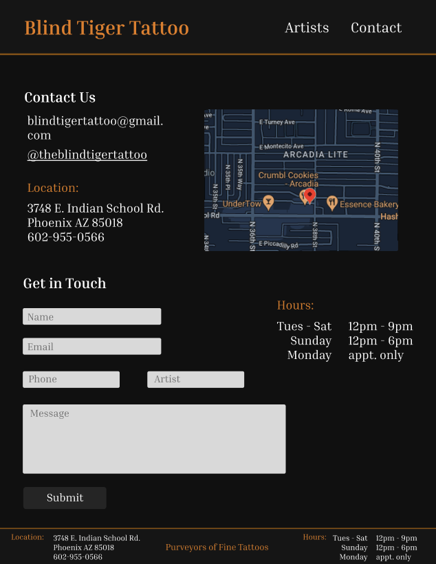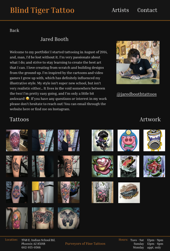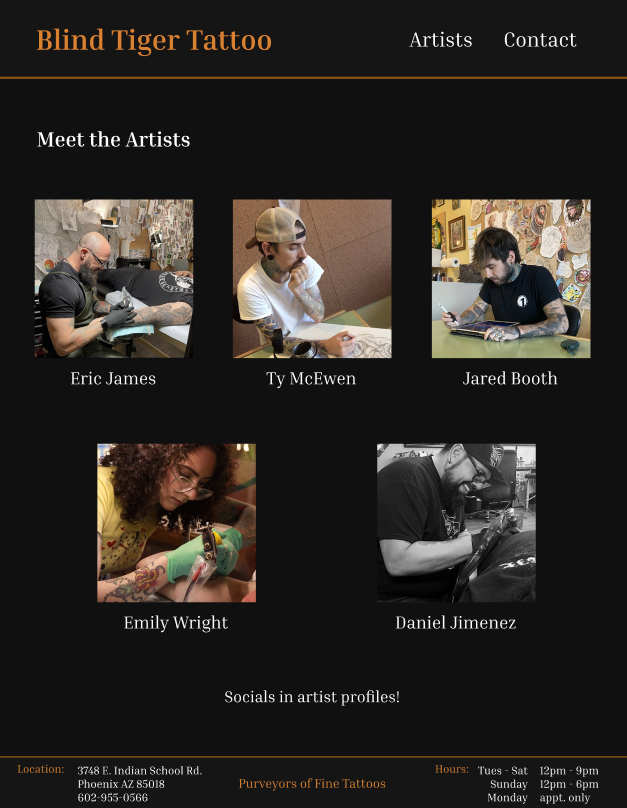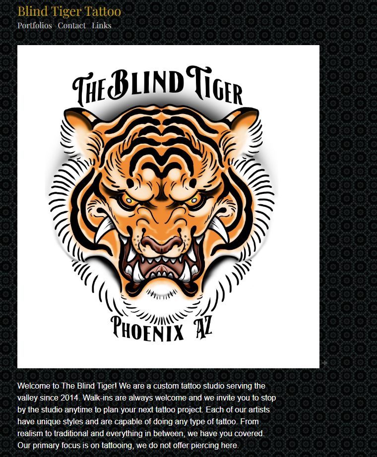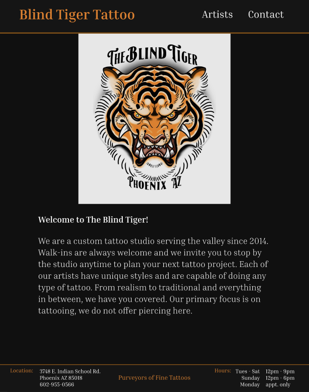 Blind Tiger Tattoo has a weak online presence in the form of their website. If a user’s first encounter with the studio was through their website, they are not likely to appear in person. The website is not well designed, the organization of information is confusing, and navigating the site can be frustrating. The website is in desperate need of a redesign to remove these issues and improve the overall user experience.