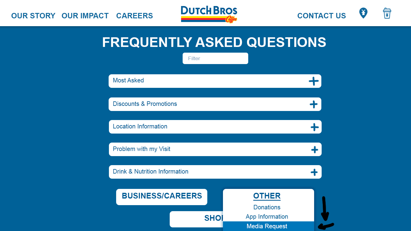 Most of the interviewed users were within the range of Dutch Bros’ target audience. Out of three scenarios, only one could not be completed by any of the participants. After the user testing, issues were found within the menu, contact, and impact pages. Some faced frustration due to the lack of images for many menu items, while others saw the number of options in the contact page as overwhelming and hard to navigate. And interestingly, there was hidden text on the impact page that can only be seen while highlighted.