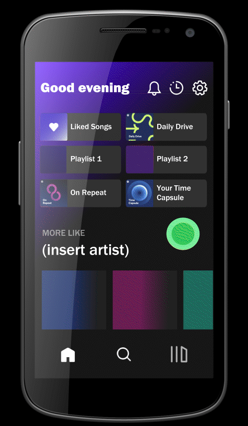 Most of the layouts remained the same, but the app was lacking appealing transitions. To breathe new life into the app, various transitions were designed and animated to give viewers an idea of how they function in practice. An active search icon with a text field that spreads across the width of the screen was added. While in the home page, a brightness effect can be seen when a playlist is clicked. From there, the songs move onto into view, which leads into the chosen song growing into the next screen as the play options pop in. Roughly a week was given to brainstorm and build an animation of an improved user experience.